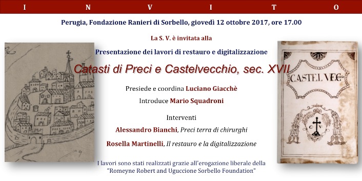 Presiede e coordina Luciano Giacchè, introduce Mario Squadroni. Saluti di Ruggero Ranieri, presidente Fondazione Ranieri di Sorbello di Perugia, Nicola Alemanno, sindaco di Norcia, Pietro Bellini, sindaco di Preci, Rossella Santolamazza, Soprintendenza archivistica e bibliografica dell'Umbria e delle Marche. Gli interventi saranno a cura di Alessandro Bianchi - "Preci terra di chirurghi" e Rosella Martinelli - "Il restauro e la digitalizzazione".