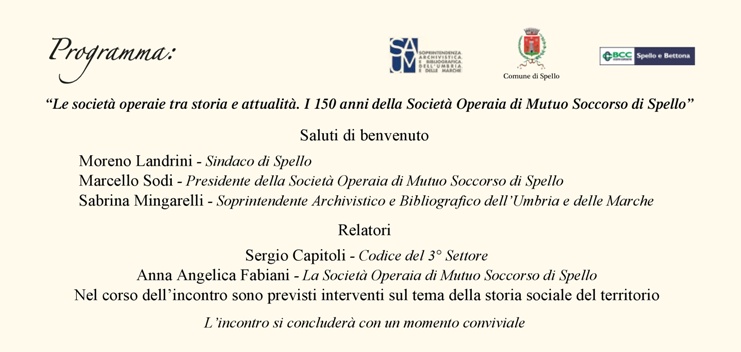 Prenderanno parte all'iniziativa: Moreno Landrini - Sindaco di Spello, Marcello Sodi - Presidente della Società Operaia di Mutuo Soccorso di Spello e Sabrina Mingarelli - Soprintendente Archivistico e Bibliografico dell’Umbria e delle Marche per i saluti di benvenuto. I relatori dell'evento saranno: Sergio Capitoli - Codice del 3° Settore e Anna Angelica Fabiani - La Società Operaia di Mutuo Soccorso di Spello.