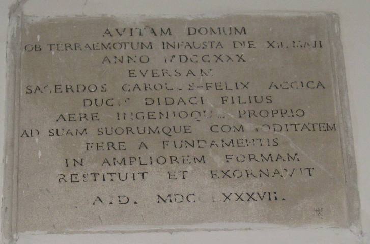 Si segnala una lapide, che è visibile nel video, affissa all’interno del Palazzo con scritta in latino di cui segue la traduzione: “L’avita dimora distrutta a causa del terremoto nell’infausto giorno del 12 maggio dell’anno 1730 il sacerdote Carlo Felice Accica figlio del duca Didaco con il proprio denaro e ingegno per comodità sua e dei suoi quasi dalle fondamenta in una forma più ampia ricostruì e adornò nel 1787”